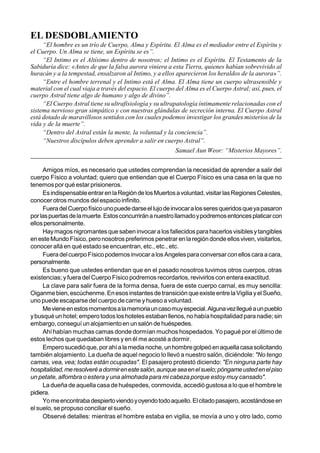 El documento habla sobre la antropología gnóstica y el desdoblamiento del alma del cuerpo físico. Explica que el hombre está compuesto de cuerpo, alma y espíritu, y que el alma es el mediador entre el espíritu y el cuerpo. También describe el cuerpo astral y cómo los discípulos deben aprender a salir del cuerpo físico de manera consciente usando técnicas como aprovechar el momento entre el sueño y la vigilia.