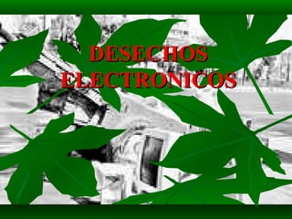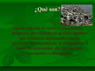 Los desechos electrónicos son residuos peligrosos provenientes de aparatos electrónicos como televisores, computadoras y refrigeradores. Contienen componentes tóxicos como plomo, mercurio y cadmio que pueden causar daños a la salud y al ambiente si son desechados en la basura regular. Es importante llevar los desechos electrónicos a centros de recolección especializados para que sean desechados de manera segura y no contaminen el medio ambiente.
