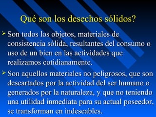 Este documento describe los desechos sólidos, su clasificación, efectos en la salud y el ambiente, y el marco legal para su manejo en El Salvador. Explica que los desechos sólidos son objetos sólidos resultantes del consumo humano que ya no son útiles, y los clasifica por composición, origen y peligrosidad. Detalla los riesgos de los desechos para la salud como vectores de enfermedades, y para el ambiente como contaminantes del agua, aire y suelo. Además, presenta la gestión integral requer