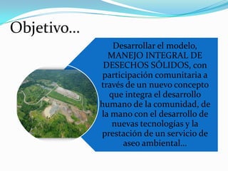 El documento presenta un modelo integral para el manejo de desechos sólidos en una comunidad con participación ciudadana. Explica que los desechos se clasifican por origen, composición y peligrosidad. Actualmente, la Autoridad de Aseo es responsable de la recolección mientras que una empresa privada administra el relleno sanitario de Cerro Patacón, el principal sitio de disposición en Panamá. Se recomienda promover la participación ciudadana y facilitar el reciclaje mediante la separación de desechos orgánicos e inorg