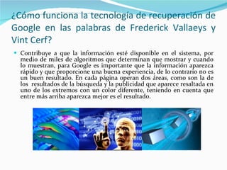 El documento discute varios temas relacionados con cómo funciona la recuperación de información en Google. Explica que Google usa miles de algoritmos para determinar qué información mostrar y cuándo, con el fin de proveer resultados rápidos que brinden una buena experiencia al usuario. También habla sobre el papel de los enlaces entre páginas web y la autoridad sobre un tema a la hora de determinar el ranking de los resultados.