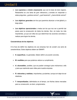 Definir objetivos claros para la empresa es fundamental para organizar la actividad y medir los resultados. Los objetivos deben estar bien definidos y ser SMART: específicos, medibles, alcanzables, relevantes y temporalizados. Existen tres grupos de objetivos: los supremos o misión empresarial, los objetivos generales a largo plazo, y los objetivos operacionales o metas que determinan las acciones concretas para lograr los demás objetivos.