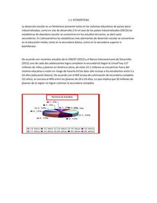 La deserción escolar se refiere al abandono de la escuela antes de completar el nivel educativo establecido. Existen múltiples factores que contribuyen a la deserción, incluyendo falta de recursos económicos, desintegración familiar, bajo rendimiento escolar, y problemas de salud. Los programas de prevención en América Latina se enfocan en transferencias monetarias condicionadas, segundas oportunidades educativas, y aceleración de aprendizajes. La influencia de los padres también es clave, pues