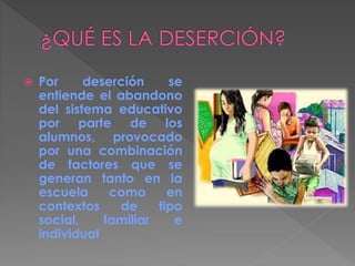 El documento describe las causas de deserción escolar, incluyendo falta de interés, problemas económicos, motivos familiares y embarazo no deseado. Presenta estadísticas sobre las razones del abandono escolar entre edades 15-19 años. Propone estrategias como atender el progreso académico desde edades tempranas y crear un ambiente escolar positivo para prevenir la deserción.