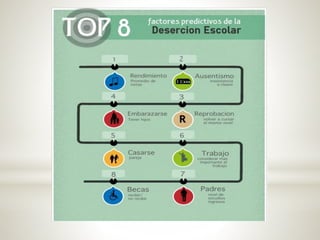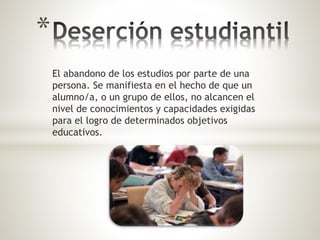 Este documento trata sobre la deserción estudiantil. Explica que la deserción se produce cuando un estudiante no alcanza los objetivos educativos requeridos. Las principales razones para la deserción son factores económicos, problemas familiares y falta de motivación. Además, la deserción afecta negativamente la fuerza laboral y la productividad de un país.
