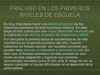 El documento describe el fracaso escolar en los primeros niveles de educación y la importancia de su detección temprana. El fracaso escolar se puede observar a través de conductas inadecuadas, repetidas repitencias y dificultades en el aprendizaje. Se recomienda realizar evaluaciones en la primera infancia para detectar cualquier trastorno y prevenir futuros problemas en el desarrollo educativo y personalidad del niño.