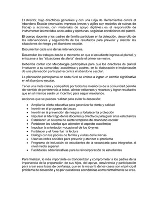 Este documento discute las causas de deserción escolar en el nivel medio superior y propone varias intervenciones para abordar este problema. Señala que la reprobación de una o más materias influye directamente en la deserción y que es necesario implementar un sistema de alerta temprana, fortalecer las tutorías académicas, y concientizar a los padres sobre la importancia de apoyar a sus hijos para prevenir que abandonen la escuela.