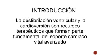 Este documento describe la desfibrilación y la cardioversión, que son tratamientos eléctricos utilizados para revertir arritmias cardíacas graves. La desfibrilación se usa para fibrilación ventricular y taquicardia ventricular sin pulso, mientras que la cardioversión se usa para arritmias estables como la fibrilación auricular. Explica los tipos de desfibriladores, los niveles de energía utilizados y los procedimientos para aplicar de manera segura y efectiva estos tratamientos.