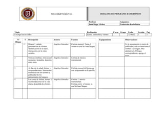 El documento presenta un desglose de programa radiofónico dividido en 4 bloques de 15 minutos cada uno. Detalla que el programa se transmitirá los lunes, miércoles y viernes y contará con una sola conductora, Angelica Gonzalez. Incluye la descripción de cada bloque, las fuentes musicales y cortinas a utilizar, así como el equipamiento y personal técnico necesarios.