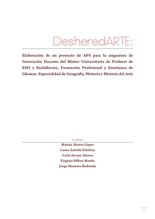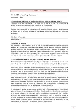 Este proyecto propone que estudiantes de 2o de ESO aprendan sobre el patrimonio cultural medieval de Palencia a través de actividades y un servicio de divulgación. Trabajarán con la Fundación Santa María la Real para investigar monumentos romanos y leyendas locales, y diseñarán murales y presentaciones para crear conciencia sobre la importancia de la conservación del patrimonio. A través de este proyecto, los estudiantes adquirirán conocimientos sobre la historia y el arte medieval de la región, así como competencias sociales y de expres