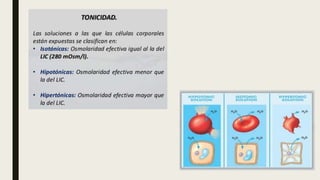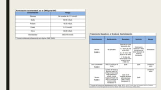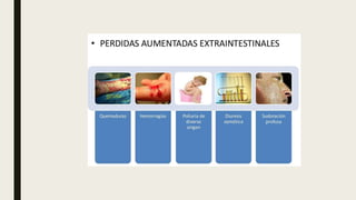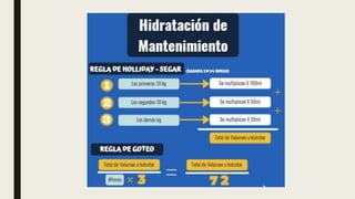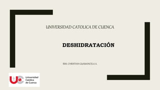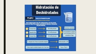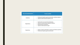 El documento define la deshidratación y clasifica sus tipos. Explica que la deshidratación ocurre cuando se pierde más líquido del cuerpo del que se ingiere, lo que reduce el volumen circulante. Se clasifica la deshidratación según su gravedad y contenido de solutos. También describe las manifestaciones clínicas, escalas de diagnóstico, exámenes complementarios, terapia de rehidratación y posibles complicaciones como alteraciones electrolíticas o shock.