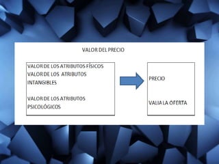 Este documento discute las decisiones sobre precios. Explica la importancia de los precios y los objetivos de fijar precios. Analiza los factores internos y externos que afectan los precios. También describe métodos para determinar precios como costos, demanda y competencia. Finalmente, cubre estrategias de precios como tácticas para nuevos productos.