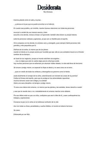 Este poema ofrece consejos para vivir una vida plena y en paz, incluyendo caminar plácidamente entre el ruido, mantener buenas relaciones con los demás, evitar personas agresivas, no compararse con otros, disfrutar los éxitos propios, ser cauto pero no cínico, aceptar los consejos de la experiencia y estar en paz con uno mismo y el universo.