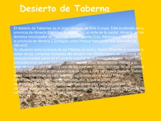 El Desierto de Tabernas es el único desierto de Europa, localizado en Almería, España. Es hogar de una gran diversidad de plantas y animales que se han adaptado a sus condiciones áridas. Parte del desierto se ha convertido en un parque temático sobre el Viejo Oeste, con decorados de películas western filmadas allí, y una reserva zoológica con más de 150 especies de animales.