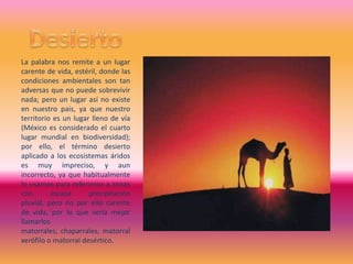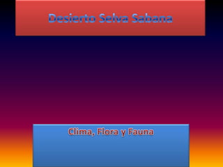 Este documento describe y compara tres ecosistemas: el desierto, la selva y la sabana. Describe el clima, la flora y la fauna de cada ecosistema. Explica que en los desiertos hay pocas precipitaciones pero aún así existe mucha vida, como cactus, insectos, reptiles y algunos mamíferos. Luego describe que las selvas se caracterizan por su densa vegetación de múltiples niveles y gran diversidad de especies, con clima cálido y húmedo que soporta muchos tipos de animales como monos