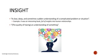 El documento explora el concepto de 'consumer insights', enfatizando la importancia de comprender las emociones, necesidades y comportamientos del consumidor desde una perspectiva antropológica. Se destaca que el éxito de una marca radica en conectar emocionalmente con los consumidores, utilizando insights que revelan verdades internas y aspiracionales. Además, se menciona que los consumidores son influenciados por su entorno social y cultural, lo que requiere un enfoque más empático y humano en el marketing.