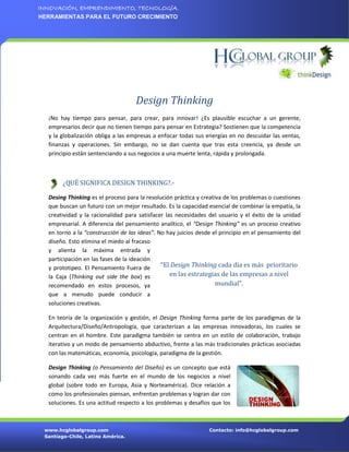 El documento describe el concepto de Design Thinking. Se define como un proceso creativo para resolver problemas que busca mejores resultados futuros, combinando empatía, creatividad y racionalidad para satisfacer las necesidades de los usuarios. Expertos como Tim Brown sostienen que es una metodología que impregna la innovación centrada en el ser humano. El Design Thinking aplica un enfoque de prueba y error para desarrollar soluciones creativas a los desafíos empresariales.