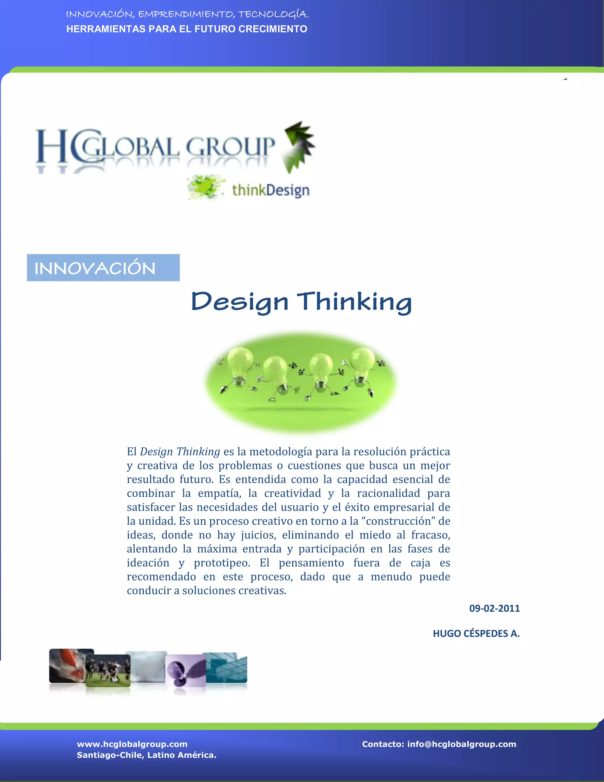El documento describe el concepto de Design Thinking. Se define como un proceso creativo para resolver problemas que busca mejores resultados futuros, combinando empatía, creatividad y racionalidad para satisfacer las necesidades de los usuarios. Expertos como Tim Brown sostienen que es una metodología que impregna la innovación centrada en el ser humano. El Design Thinking aplica un enfoque de prueba y error para desarrollar soluciones creativas a los desafíos empresariales.