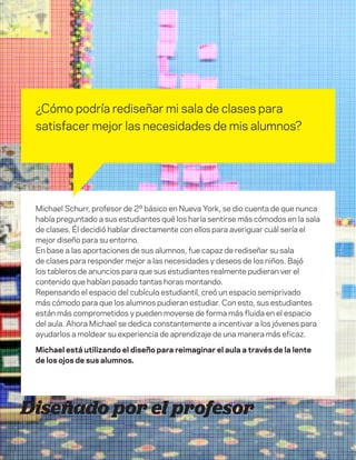 El documento explora la aplicación del design thinking en la educación para rediseñar aulas y enfoques de enseñanza, centrándose en las necesidades de los estudiantes. Ejemplos como el profesor Michael Schurr y la escuela primaria Ormondale ilustran cómo la colaboración y la empatía pueden transformar el aprendizaje. Se enfatiza la importancia de que los educadores se conviertan en diseñadores proactivos para abordar los desafíos educativos contemporáneos.