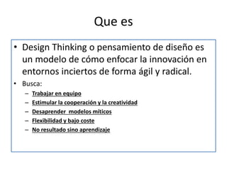Design thinking is a innovation generator that can be applied to any field. It is a human-centered approach to innovation that aims to match what is technically feasible with what people need and will value. It uses techniques like prototyping and collaboration to generate new solutions.