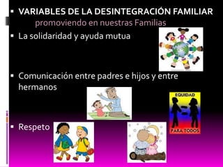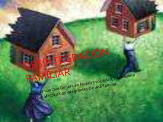 Este documento describe las diferentes formas en que puede desintegrarse una familia, incluyendo el divorcio, la falta de comunicación entre los miembros de la familia, y el abandono involuntario debido a la muerte de un padre. También discute las causas de la desintegración familiar como la pobreza, la infidelidad y la violencia doméstica, así como las consecuencias negativas que tiene en los hijos. Finalmente, enfatiza la importancia fundamental de la familia como núcleo de la sociedad.