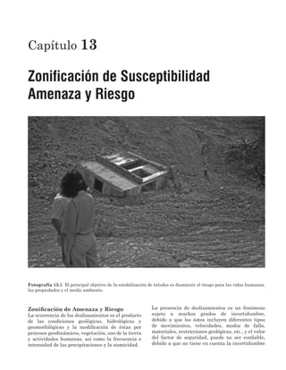 Este documento describe los conceptos clave relacionados con la zonificación de amenazas y riesgos de deslizamientos, incluyendo definiciones de términos como riesgo, amenaza, vulnerabilidad y probabilidad. También explica las herramientas utilizadas para la zonificación como la lógica difusa, los modelos digitales de elevación y los sistemas de información geográfica. Finalmente, brinda detalles sobre los diferentes enfoques de modelación y los componentes básicos de un sistema de información geográfica.