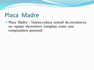 El documento describe los principales componentes de una computadora durante el proceso de desmontaje. Estos incluyen la placa madre, la memoria RAM, el disco duro, el microprocesador, la fuente de poder, resistencias y condensadores. Para cada componente, se mencionan algunas marcas y modelos comunes.