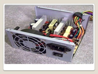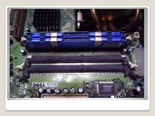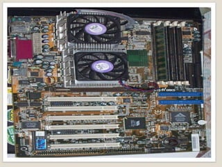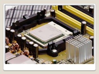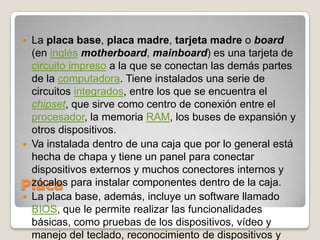 El documento describe los componentes principales de una computadora y sus funciones. Menciona que la placa base conecta las demás partes y contiene circuitos integrados como el chipset. También describe el microprocesador como el componente clave, la memoria RAM donde se almacena temporalmente la información, el disco duro para almacenamiento permanente, y otros componentes como la fuente de poder y cables.