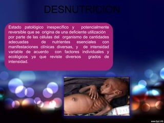 La desnutrición es un estado patológico causado por la deficiencia en la utilización de nutrientes esenciales por las células, lo que afecta la supervivencia, desarrollo y capacidades cognitivas de los niños. Existen diferentes tipos como la desnutrición primaria por falta de alimentos, secundaria por enfermedades, y mixta. Los signos incluyen retraso en el peso, talla y maduración ósea, piel seca y cabello delgado. Se clasifica según el grado de déficit de