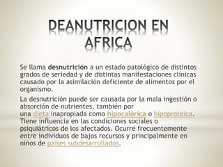 La desnutrición es un problema de salud grave causado por la ingesta deficiente de nutrientes y calorías, y es común en países subdesarrollados, especialmente entre niños de bajos recursos. Los síntomas incluyen bajo peso, estatura y debilidad, y puede causar retrasos en el desarrollo e incluso la muerte. La desnutrición crónica es un problema particular en África y otras regiones pobres, donde la pobreza y la mala alimentación son las causas principales.