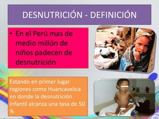 En Perú, más de medio millón de niños sufren de desnutrición, siendo Huancavelica la región con la tasa más alta del 50%. La desnutrición se define como la deficiencia de ingesta de calorías y proteínas, y está relacionada con la pobreza y una dieta inadecuada. Para prevenirla, se recomienda una dieta balanceada, lactancia materna, y controles prenatales regulares.