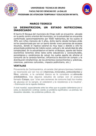 El documento describe la desnutrición en un barrio de Bolivia y sus causas. Explica que el barrio El Bosque tiene alrededor de 4500 habitantes, de los cuales el 35% son niños menores de 5 años. Los residentes tienen pocos recursos y bajos ingresos, lo que ha causado problemas de salud y nutrición. La desnutrición continúa siendo un problema significativo para los niños en todo el mundo debido a la pobreza, desastres naturales y problemas políticos.
