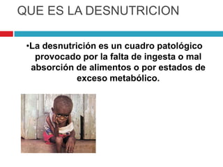 La desnutrición es un cuadro patológico causado por falta de ingesta o mala absorción de alimentos. Puede ser primaria debido a dieta inadecuada, pobreza o enfermedades, o secundaria cuando enfermedades interfieren con la digestión. La desnutrición causa cambios metabólicos, hormonales y en los sistemas inmunológico, nervioso y gastrointestinal que afectan el crecimiento y desarrollo. Se clasifica dependiendo del grado de déficit nutricional y puede manifestarse como marasmo o kw