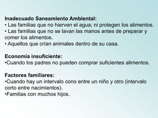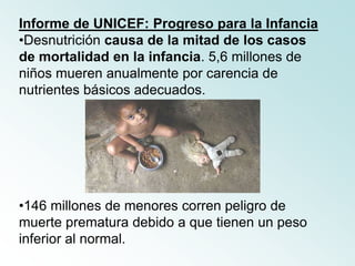 La desnutrición infantil causa la mitad de las muertes de niños y afecta a 146 millones. En la Argentina, la desnutrición sigue siendo un problema, con tasas altas en provincias como Jujuy, La Matanza y Salta. La desnutrición puede ser crónica o aguda y causar complicaciones como anemia y raquitismo. Para prevenirla, es importante promover una alimentación adecuada, vacunaciones, saneamiento básico y atención médica para los niños.