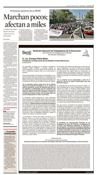 El 16 de febrero de 2013, un contingente de la CNTE realizó una manifestación de ocho horas en la Ciudad de México en contra de la reforma educativa, complicando la circulación y afectando a miles de capitalinos. Los maestros bloquearon avenidas principales y solicitaron una reunión con autoridades educativas para abordar sus demandas. Al finalizar la protesta, se acordó una reunión con diputados para considerar sus inquietudes respecto a la reforma.