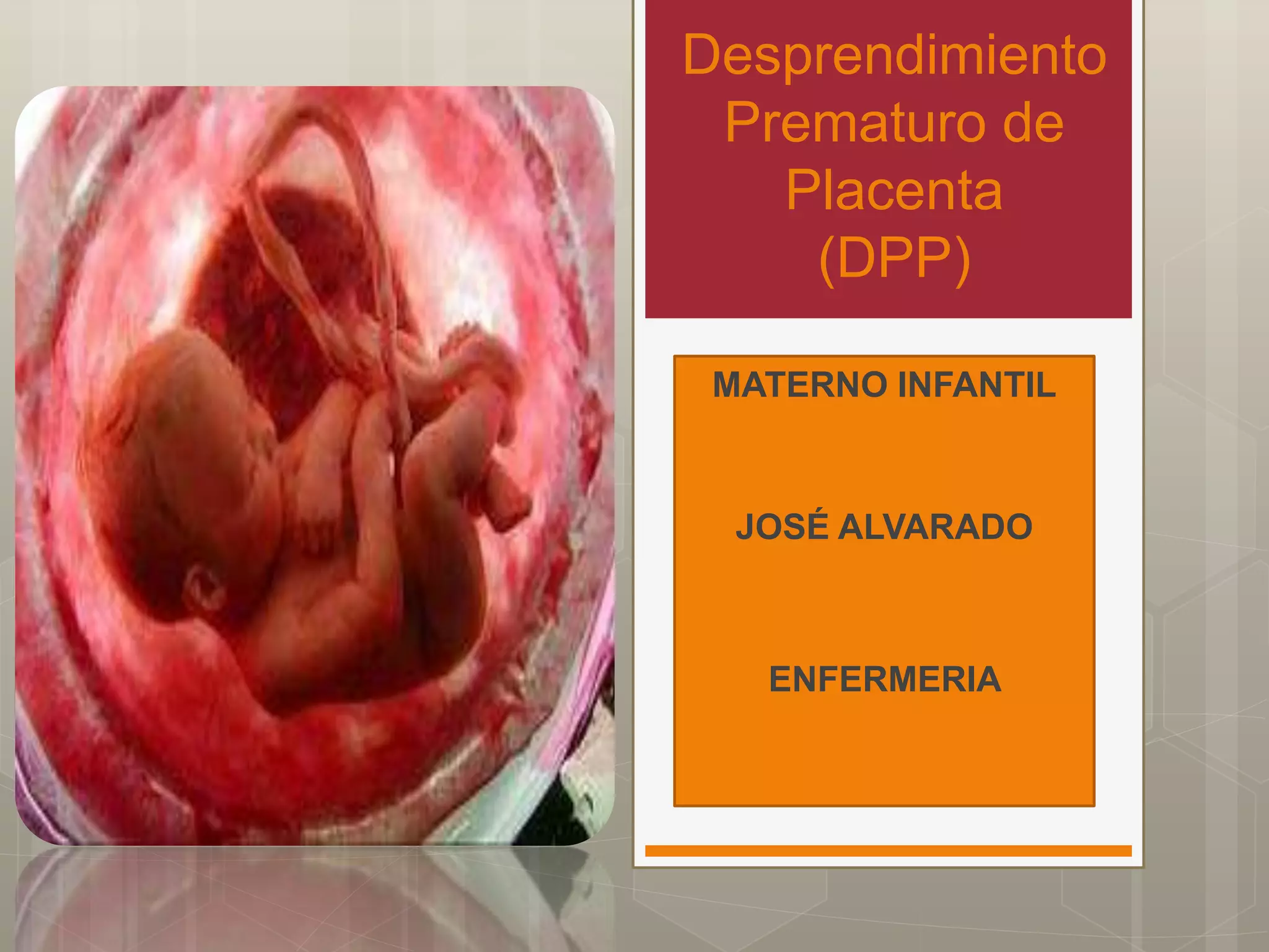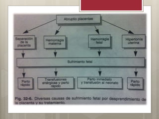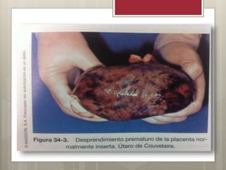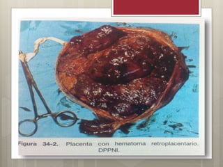 El desprendimiento prematuro de placenta (DPP) ocurre cuando la placenta se desprende de la pared uterina antes del parto. Puede ser parcial o total. Los síntomas incluyen sangrado vaginal oscuro, dolor uterino y sufrimiento fetal. El diagnóstico se basa en los síntomas clínicos y ecografía. El tratamiento involucra medidas para detener la hemorragia como oxitocina y metilergonovina, transfusiones de sangre y entrega del feto y placenta. Las complicaciones pueden