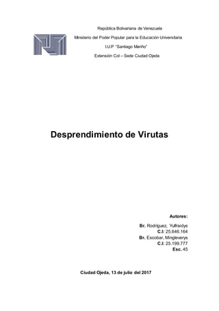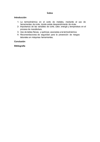 Este documento describe el proceso de desprendimiento de virutas durante el corte de metales utilizando herramientas de corte. Explica que el desprendimiento de virutas requiere la aplicación de deformación al material mediante variables como la energía, temperatura y calor. También discute las recomendaciones de seguridad para prevenir riesgos laborales al usar máquinas herramientas, como el uso de protección ocular y ropa ajustada.