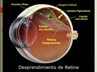 Este documento describe el desprendimiento de retina, incluyendo su causa, síntomas, diagnóstico, tratamiento y prevención. La retina es la capa sensible a la luz en el ojo. Un desprendimiento de retina ocurre cuando la retina se separa del epitelio pigmentario subyacente, lo que puede causar pérdida parcial o total de la visión. El tratamiento incluye cirugía con láser, vitrectomía u otras técnicas para recolocar la retina. Con un diagnóstico y tratamiento tempranos, el pronóst