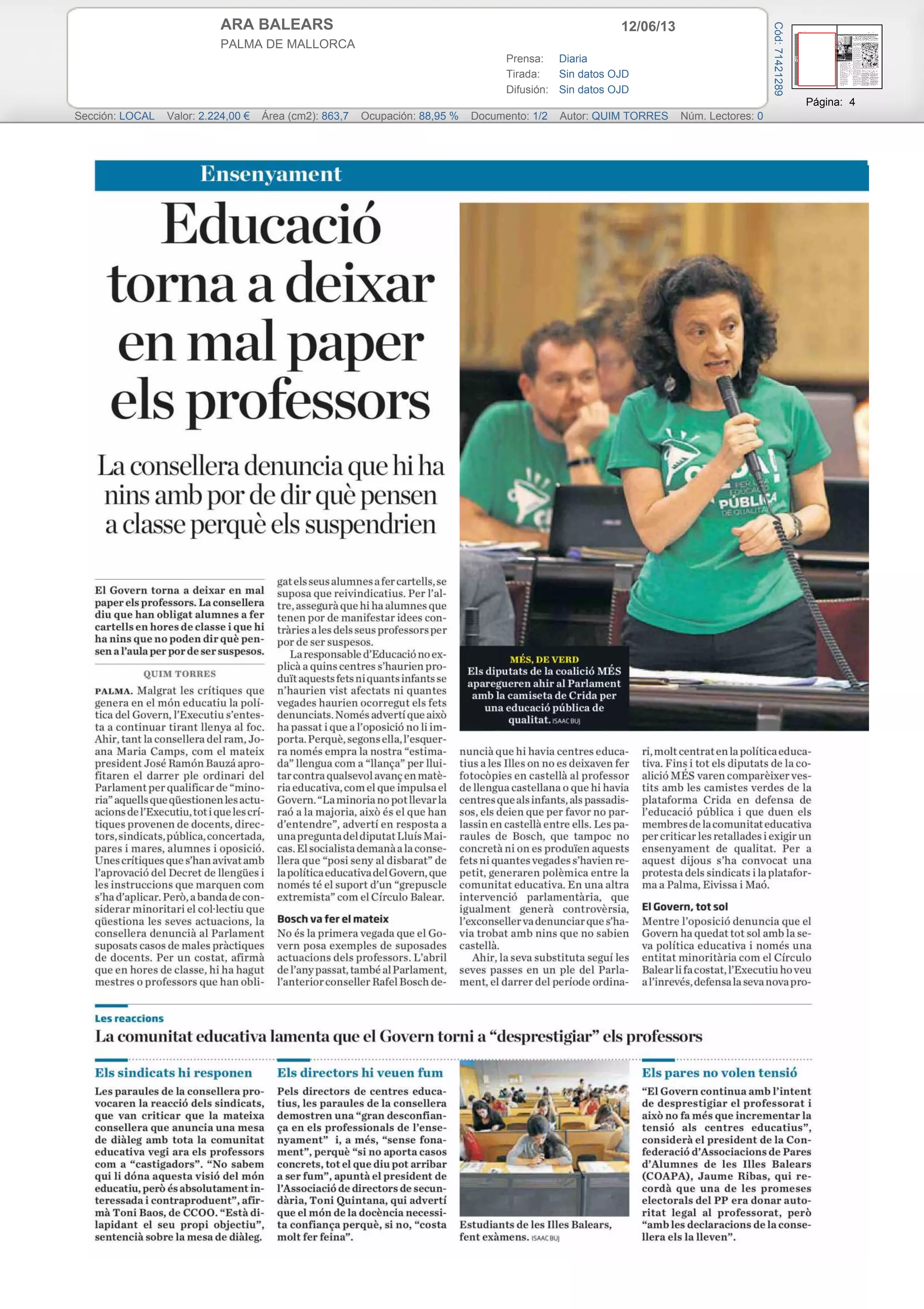 Este documento presenta información sobre dos anuncios publicados en el periódico ARA BALEARS. El primer anuncio tuvo un valor de 2,224 euros y ocupó el 88.95% del área en la página 4. El segundo anuncio en la página 5 tuvo un valor de 846 euros y ocupó el 33.82% del área. Ambos anuncios fueron escritos por el autor Quim Torres.