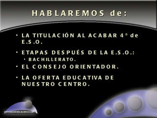 El documento resume las opciones educativas y profesionales disponibles después de completar la educación secundaria obligatoria en España. Explica que los estudiantes reciben un título de graduado en educación secundaria obligatoria después de completar 4o grado, el cual les da acceso a bachillerato u otras formas de formación y el mundo laboral. Describe las diferentes modalidades de bachillerato que ofrece el centro y las materias que comprenden cada una. Finalmente, indica que después de aprobar todas las materias de bachillerato, los estudiantes rec