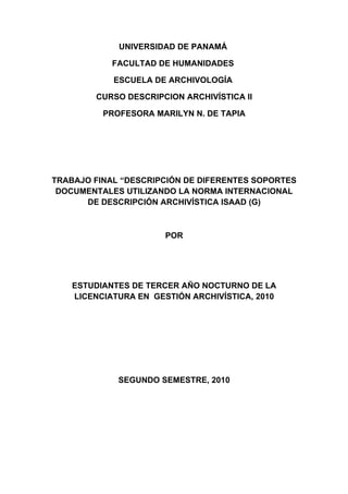 Este documento presenta el trabajo final de estudiantes de tercer año de la Licenciatura en Gestión Archivística sobre la descripción de diferentes soportes documentales utilizando la Norma Internacional de Descripción Archivística ISAAD (G). Incluye la justificación, objetivos, norma ISAAD (G), identificación de fondos y secciones, fichas de control, cuadros de clasificación y descripción de soportes como fotografía, microfilm, mapas, planos y discos ópticos. El documento provee información