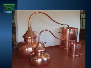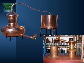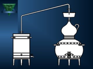 La destilación es un proceso que separa los componentes de una mezcla aprovechando sus diferentes puntos de ebullición. Se aplica calor a la mezcla hasta que sus componentes se evaporan y luego se condensan separadamente. Existen diferentes tipos de destilación como la simple, la fraccionada y la continua, así como diferentes sistemas como alambiques y columnas que permiten lograr diferentes grados de pureza en los productos destilados.