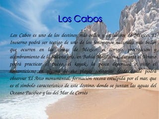 El documento presenta resúmenes breves de varios destinos turísticos notables en todo el mundo, incluidos Los Cabos en México, el Puente Juscelino Kubitschek en Brasilia, Río de Janeiro en Brasil, el Cañón del Colorado en Estados Unidos, Londres en el Reino Unido, las Cataratas del Niágara entre Estados Unidos y Canadá, la Estatua de la Libertad en Nueva York, la Torre Inclinada de Pisa en Italia y Acapulco en México. Cada destino ofrece paisajes natural