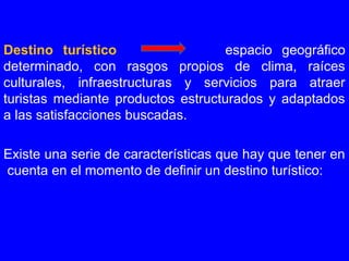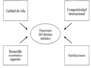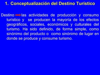 El documento describe los conceptos clave relacionados con los destinos turísticos. Define un destino turístico como un espacio geográfico con atractivos y recursos que ofrece productos turísticos estructurados. Explica que los destinos turísticos tienen cuatro funciones principales: mejorar la calidad de vida de los residentes, lograr competitividad internacional, promover el desarrollo económico y satisfacer a los turistas y residentes. Además, identifica a los turistas, empresas turísticas, administraciones públicas y soc