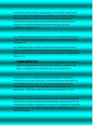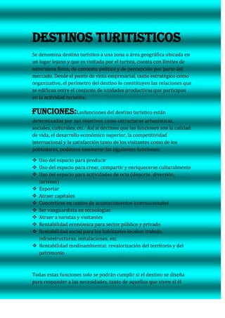 Este documento describe los conceptos clave relacionados con los destinos turísticos. Define un destino turístico como una zona geográfica visitada por turistas que cuenta con límites físicos, políticos y de percepción. Explica que las funciones de un destino turístico incluyen el uso del espacio para producir, compartir cultura y ocio, exportar, atraer capital e inversiones, y satisfacer tanto a visitantes como residentes. Finalmente, señala que los destinos se componen de productos turísticos estructurados a partir