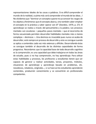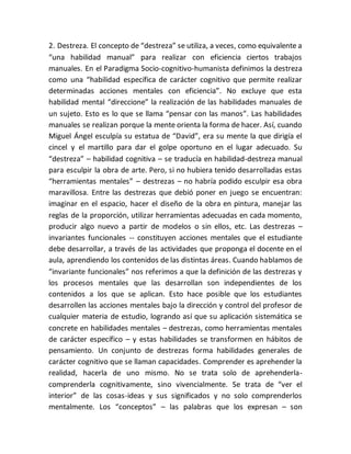 El documento define la destreza como una habilidad cognitiva específica que permite realizar acciones mentales de manera eficiente. Explica que las destrezas mentales dirigen las habilidades manuales, como se ve en el ejemplo de Miguel Ángel esculpiendo. Las destrezas son invariantes funcionales que los estudiantes deben desarrollar a través de actividades en el aula para aprender contenidos de diferentes áreas. El desarrollo de destrezas forma habilidades generales como la comprensión, la cual es fundamental para el aprendizaje.