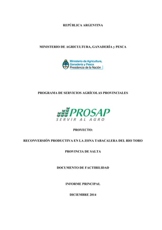 El proyecto de reconversión productiva en la zona tabacalera del río Toro en la provincia de Salta busca mejorar la infraestructura de riego y capacidades técnicas de los productores, abordando desafíos identificados en la agricultura de la región. Se prevé una ejecución de 24 meses a partir de febrero de 2015 y está respaldado por un equipo técnico especializado. Los principales objetivos incluyen la mejora de la infraestructura, asistencia técnica y fortalecimiento institucional para beneficiar a los productores locales.