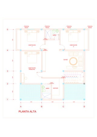 El documento contiene planos y detalles de una estructura de concreto y acero para una casa de dos plantas. En la planta baja se muestran un comedor, cocina y servicios. En la planta alta se muestran cuatro habitaciones. Se incluyen detalles de cimientos, losas, vigas, columnas y techo, así como una lista de materiales con sus especificaciones y cantidades.