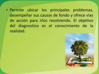 El documento habla sobre el diagnóstico como una herramienta para identificar problemas, sus causas y posibles soluciones. Explica que el diagnóstico debe proveer cuatro elementos clave: un cuadro de necesidades, recursos disponibles, alternativas de acción y la alternativa más factible para formular el proyecto. También destaca la importancia de establecer prioridades entre las necesidades identificadas y delimitar con precisión el problema que se abordará.