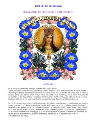 Este documento contiene varias oraciones cristianas dirigidas a Dios, Jesucristo y diferentes santos para pedir protección contra el mal y los enemigos. Incluye oraciones al Justo Juez, San Benito, San Patricio, San Miguel Arcángel y el Papa León XIII, entre otros. El objetivo general es invocar la ayuda y protección divina contra fuerzas malignas y peligros mediante la mención de diferentes aspectos de la fe cristiana como la Santísima Trinidad, la Cruz, la Pasión y Resurrección de Crist